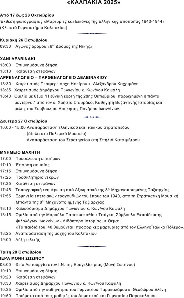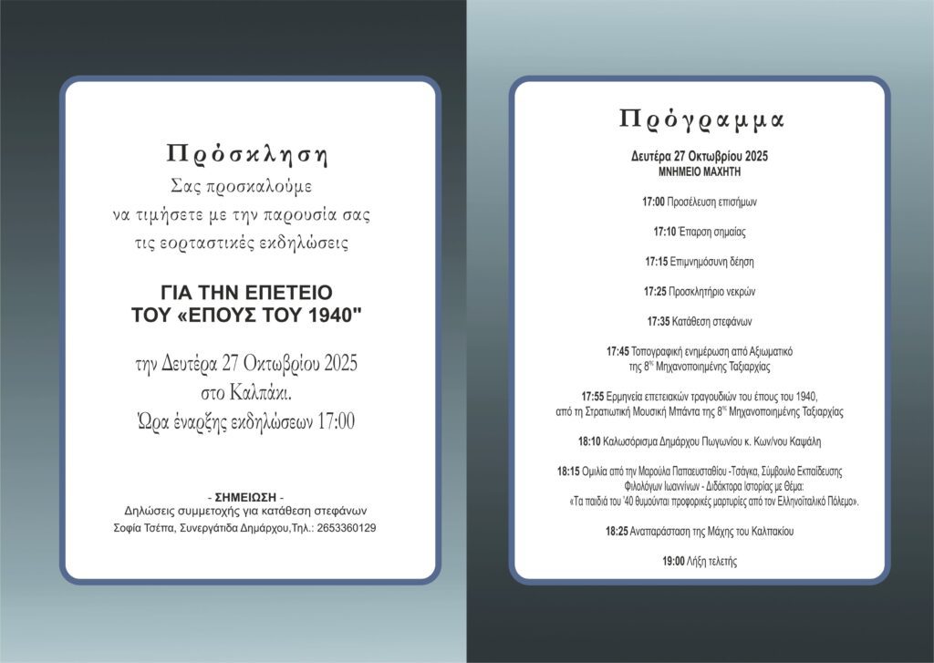 Σας προσκαλούμε να τιμήσετε με την παρουσία σας τις εορταστικές εκδηλώσεις ΓΙΑ ΤΗΝ ΕΠΕΤΕΙΟ ΤΟΥ «ΕΠΟΥΣ ΤΟΥ 1940″ την Δευτέρα 27 Οκτωβρίου 2025 στο Καλπάκι. Ώρα έναρξης εκδηλώσεων 17:00.