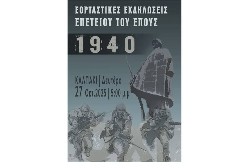 Σας προσκαλούμε να τιμήσετε με την παρουσία σας τις εορταστικές εκδηλώσεις ΓΙΑ ΤΗΝ ΕΠΕΤΕΙΟ ΤΟΥ «ΕΠΟΥΣ ΤΟΥ 1940″ την Δευτέρα 27 Οκτωβρίου 2025 στο Καλπάκι. Ώρα έναρξης εκδηλώσεων 17:00.