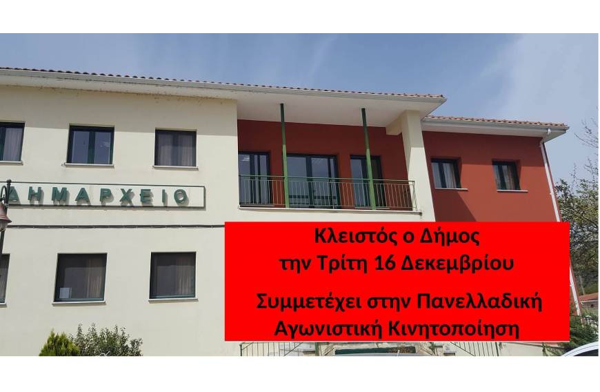 Κλειστός θα παραμείνει ο Δήμος Πωγωνίου την Τρίτη 16 Δεκεμβρίου, συμμετέχοντας στο κάλεσμα της Κ.Ε.Δ.Ε. για πανελλαδική αγωνιστική κινητοποίηση των Οργανισμών Τοπικής Αυτοδιοίκησης και στη συγκέντρωση διαμαρτυρίας στη Βουλή των Ελλήνων, ενόψει της ψήφισης του Κρατικού Προϋπολογισμού