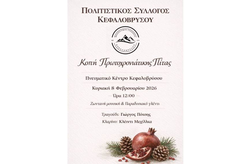 Σας προσκαλούμε στην Κοπή Πρωτοχρονιάτικης Πίτας του Πολιτιστικού Συλλόγου Κεφαλοβρύσου, η οποία θα πραγματοποιηθεί την Κυριακή, 8/2/2026 στις 12.00, στο Πνευματικό Κέντρο Κεφαλοβρύσου.