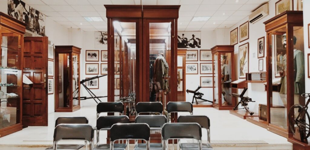 Στον προαύλιο χώρο του μουσείου ο επισκέπτης θα έχει την ευκαιρία να δει όπλα του πυροβολικού που χρησιμοποιήθηκαν στον Ελληνοϊταλικό Πόλεμο καθώς και τον ανδριάντα του συνταγματάρχου Μορδοχαίου Φριζή. Στο εσωτερικό του Μουσείου, ο επισκέπτης θα έχει την ευκαιρία να δει εκθέματα όπως ελληνικά και ιταλικά πολυβόλα όπλα, μια μηχανή από το αεροπλάνο του υποσμηναγού Ιωάννη Σακελλαρίου, στρατιωτικές ενδυμασίες Ελλήνων αξιωματικών και στρατιωτών, ελληνικά και ιταλικά τουφέκια κι όπλα εποχής, μετάλλια, στρατιωτικό ποδήλατο με ρόδες από καουτσούκ που χρησιμοποιούσαν οι Ιταλοί στρατιώτες, πλούσιο φωτογραφικό υλικό κ.α. Τέλος, χαρακτηριστική είναι η χρήση οπτικοακουστικού υλικού με την προβολήιστορικού ντοκιμαντέρ. Απέναντι από το μουσείο βρίσκονται οι ανδριάντες του Ι. Μεταξά, του Βασιλέως Γεωργίου του Β’ και του Αρχιστράτηγου Παπάγου.