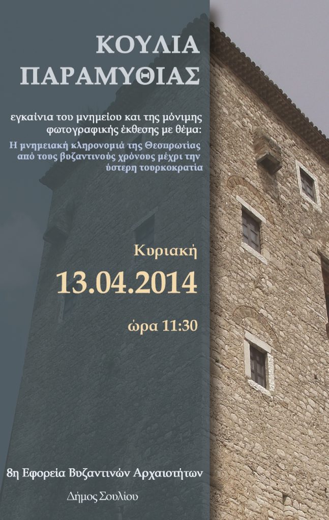 Η 8η Εφορεία Βυζαντινών Αρχαιοτήτων με ιδιαίτερη χαρά ανακοινώνει τα εγκαίνια της φωτογραφικής έκθεσης στην Κούλια Παραμυθιάς, γνωστή ως Κούλια των Μπονολάτων, στις 13.04.2014 και ώρα 11:30. Πρόκειται για ένα από τα καλύτερα σωζόμενα παραδείγματα οχυρωματικής κατοικίας στη Βορειοδυτική Ελλάδα, που χρονολογείται στο β’ μισό του 18ου-αρχές 19ου αιώνα.